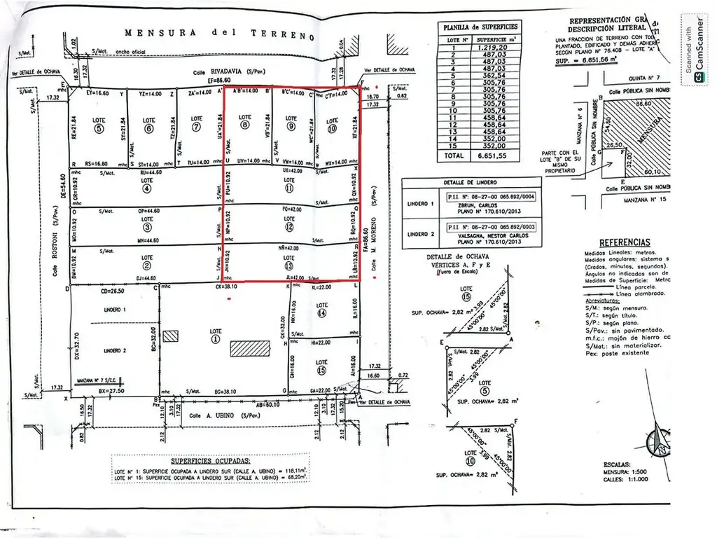 Lotes 8, 9 y 10: Cada uno de 305,76 m², (14mx21,84m) con frente sobre calle Rivadavia (orientación norte).